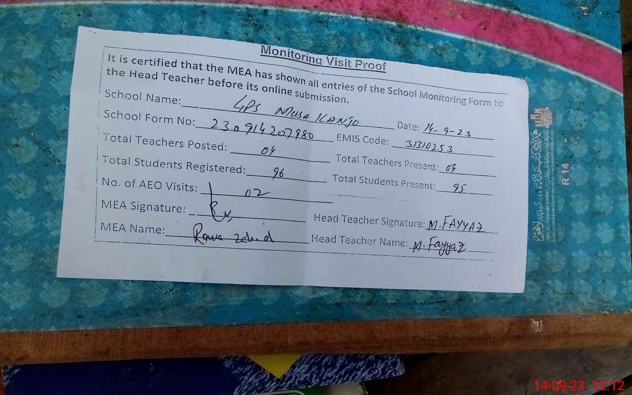 | Attendance Register | Head Teacher | MEA with School | Visit Proof |