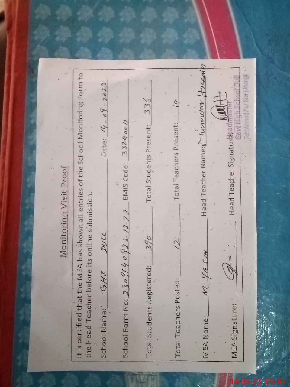 | Certified that this School was Inspected by the Undersigned MEA/DMO Today and the Information Stated Above is as Per Record. | |||||