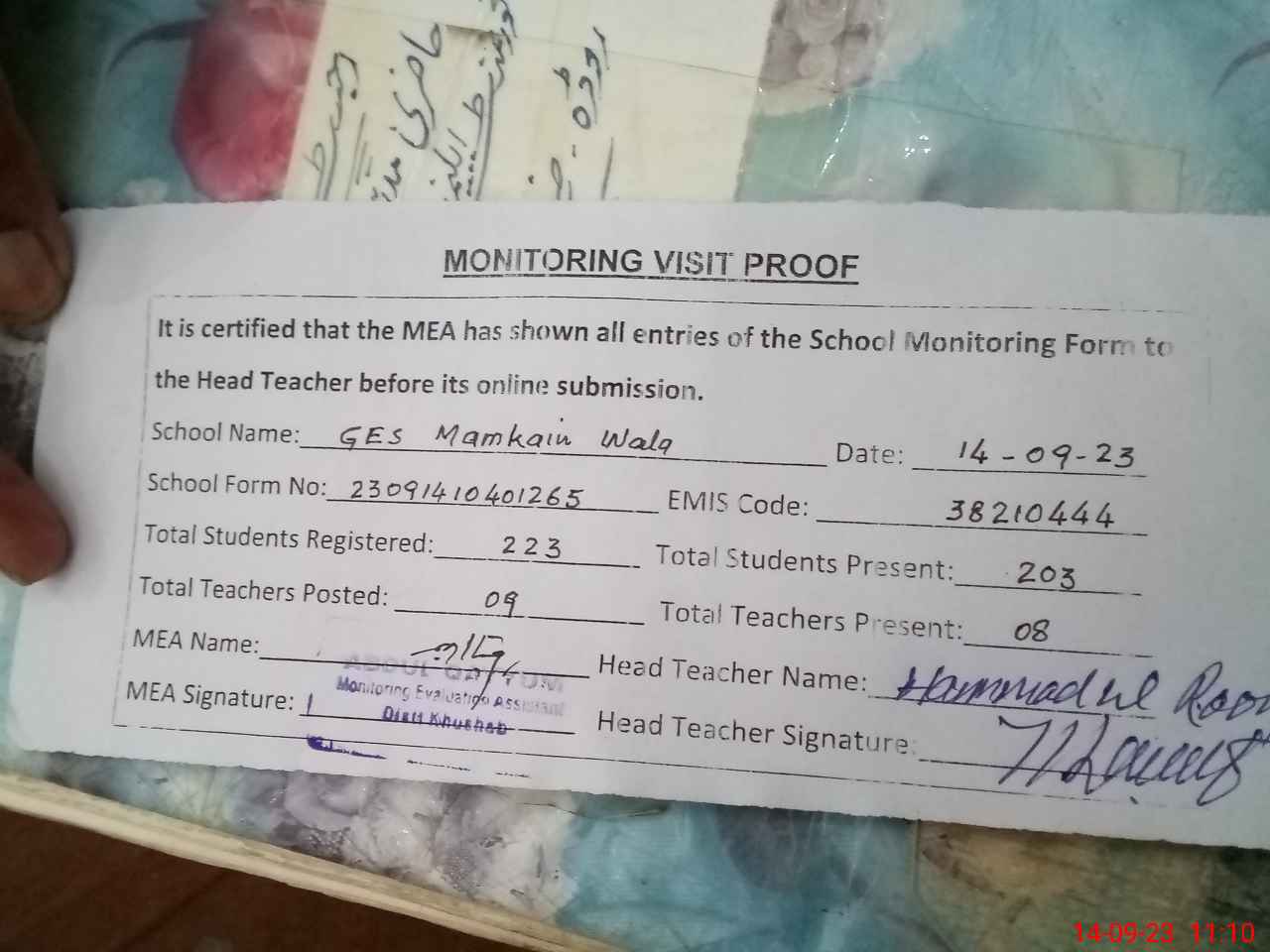 | Attendance Register | Head Teacher | MEA with School | Visit Proof |