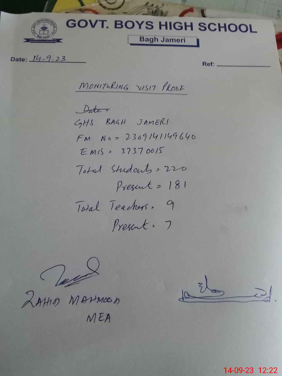 | EMIS Code: 37370015 | Name of School: GHS BAGH JAMERI | |||