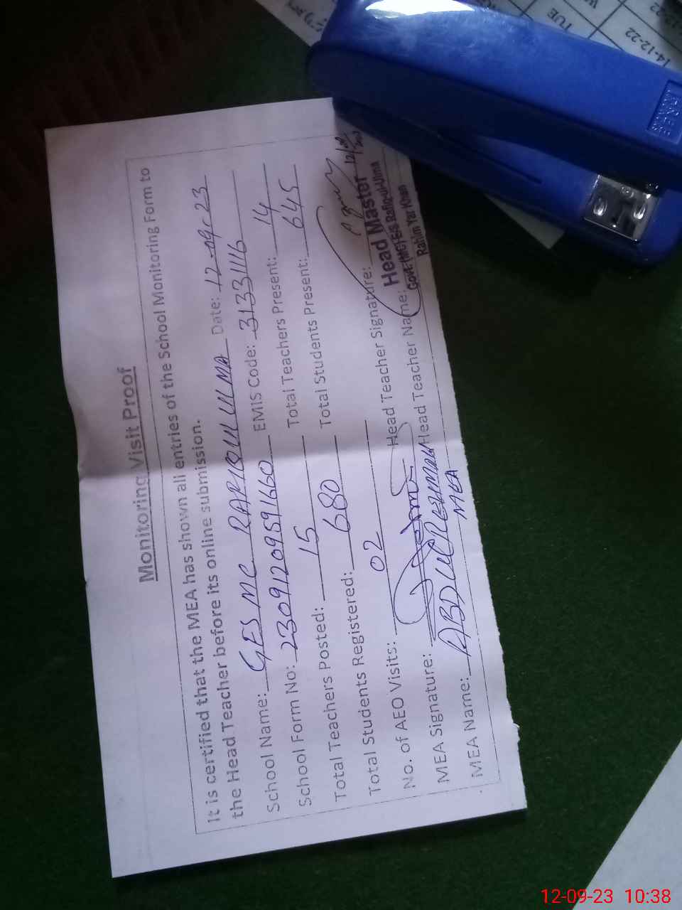 | Attendance Register | Head Teacher | MEA with School | Visit Proof |