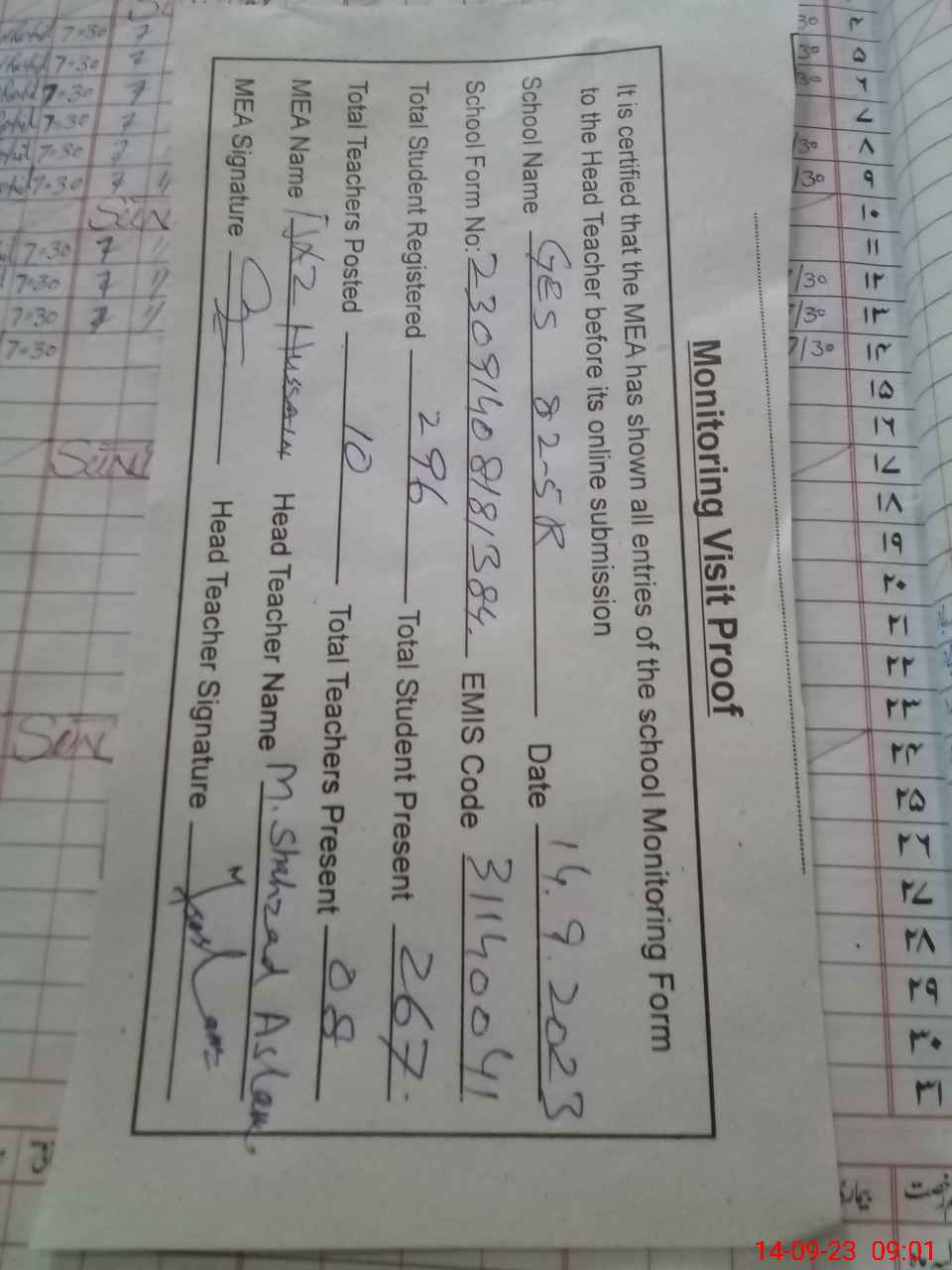 | Attendance Register | Head Teacher | MEA with School | Visit Proof |