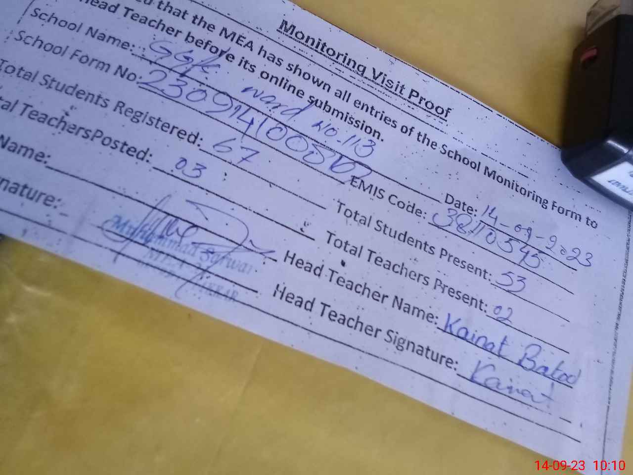 | Attendance Register | Head Teacher | MEA with School | Visit Proof |