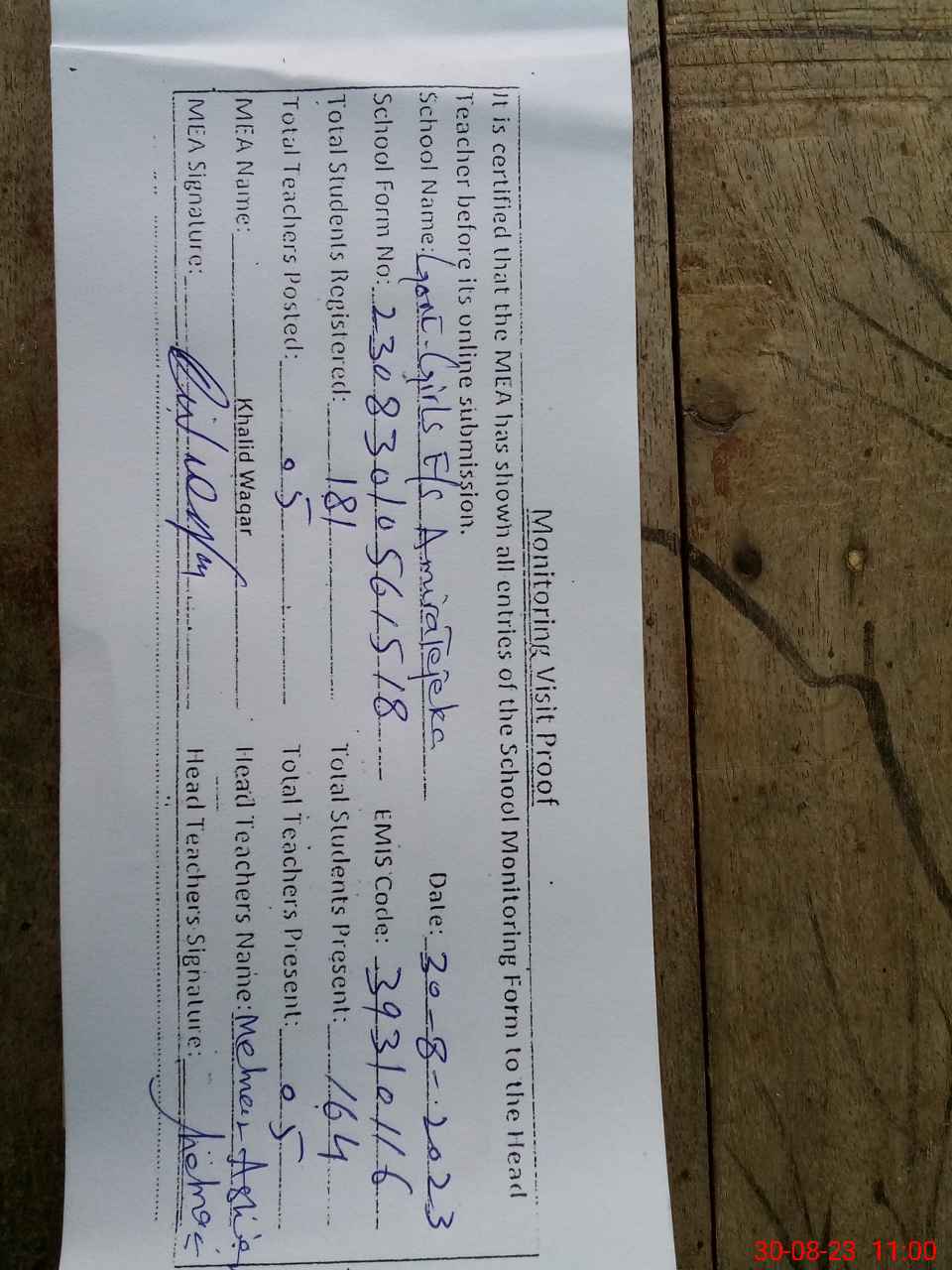 | Attendance Register | Head Teacher | MEA with School | Visit Proof |