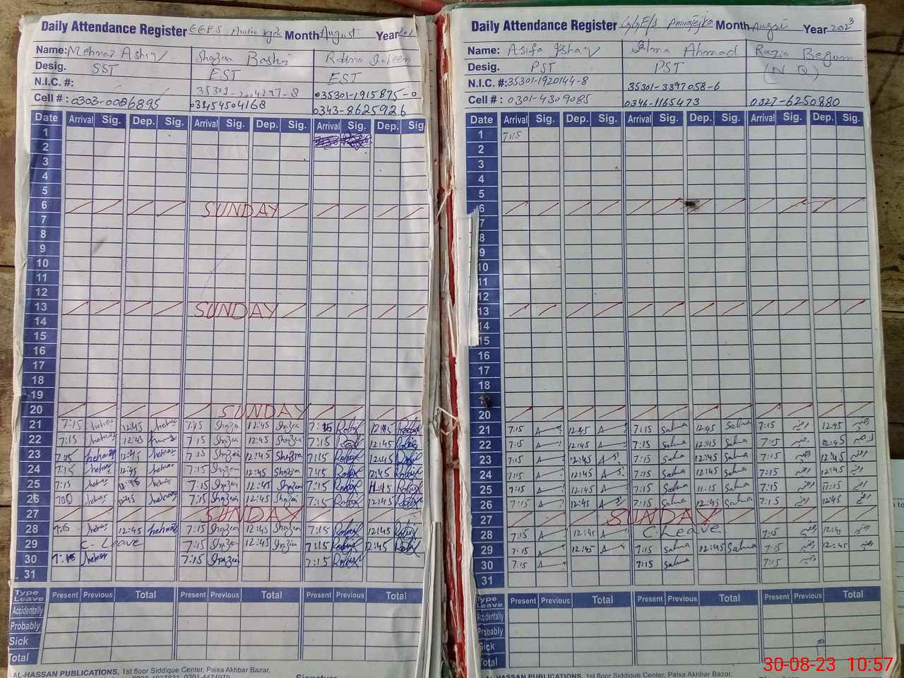 | CNIC | Full Name | Designation | R/C | Absence During Last Calender Month |