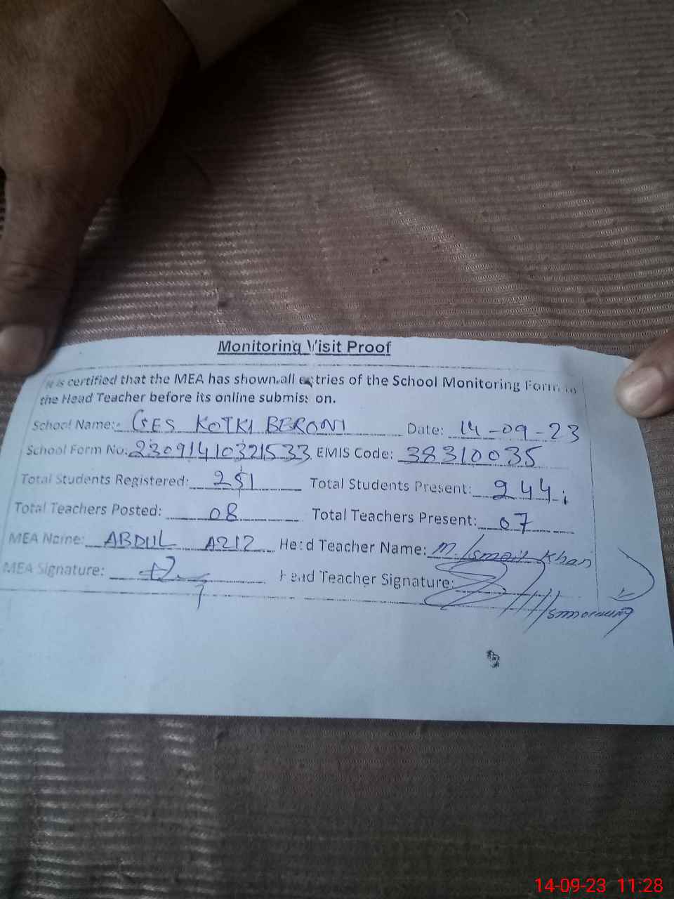 | Attendance Register | Head Teacher | MEA with School | Visit Proof |