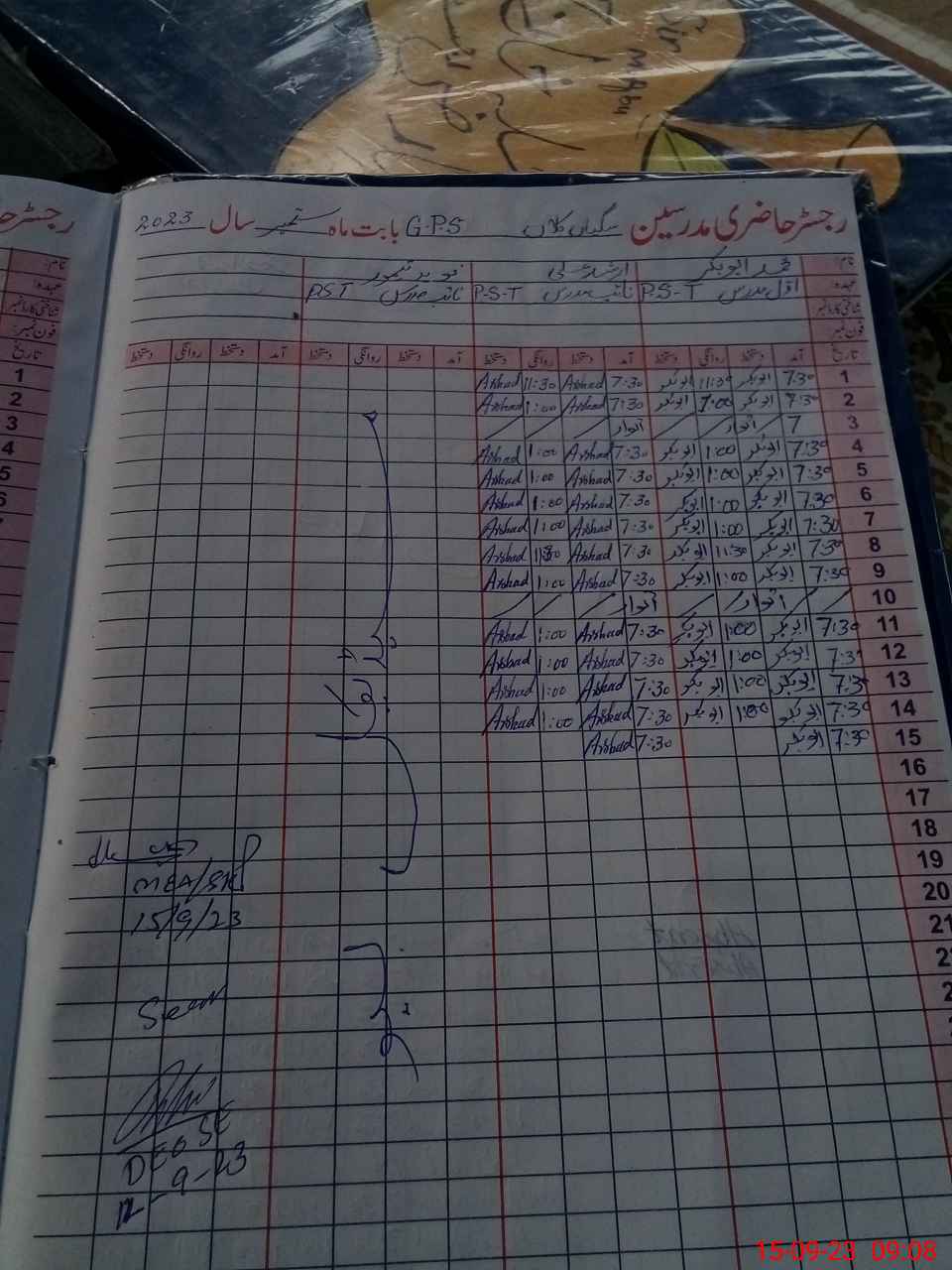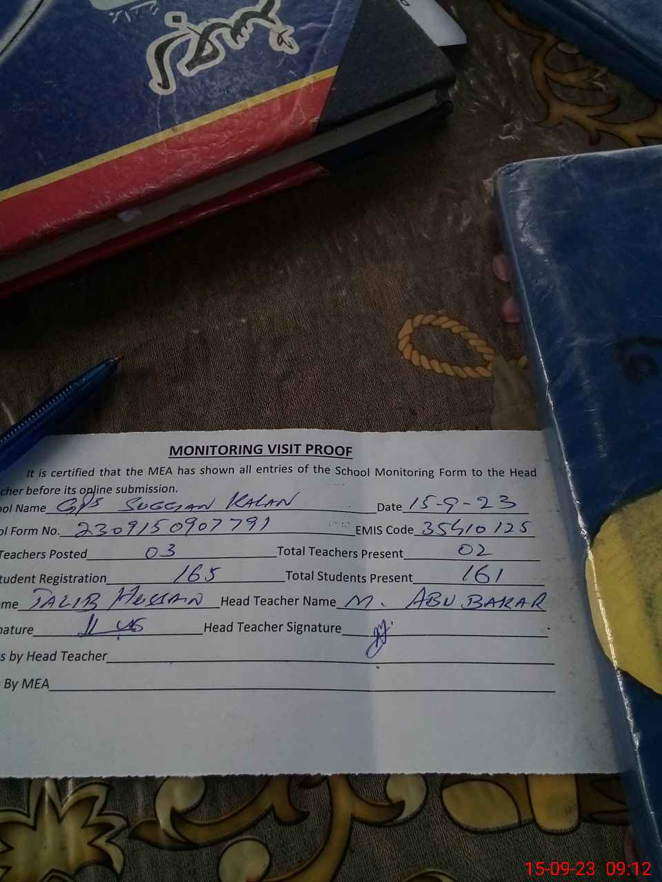| Total no. of Classrooms: 2 No. of Classrooms Used for Teaching: 2 No. of Classrooms Storing Old Furniture, FTBs, etc: 0Comments if Any: pst Naveed Temoor went to china illegally wef 8 March 2023 without NOC he is covering with Medical leave by Dpty DEO Office Ferozwsla School staff AEO and Dpty Officer Ferozwala wellknown about said absent teacher DEO SE also visted the GPS Saggi |