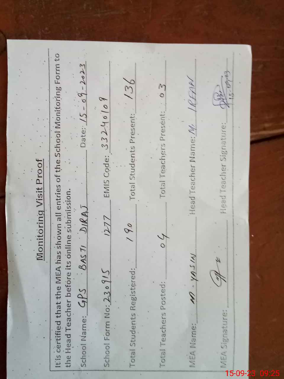 | Attendance Register | Head Teacher | MEA with School | Visit Proof |
