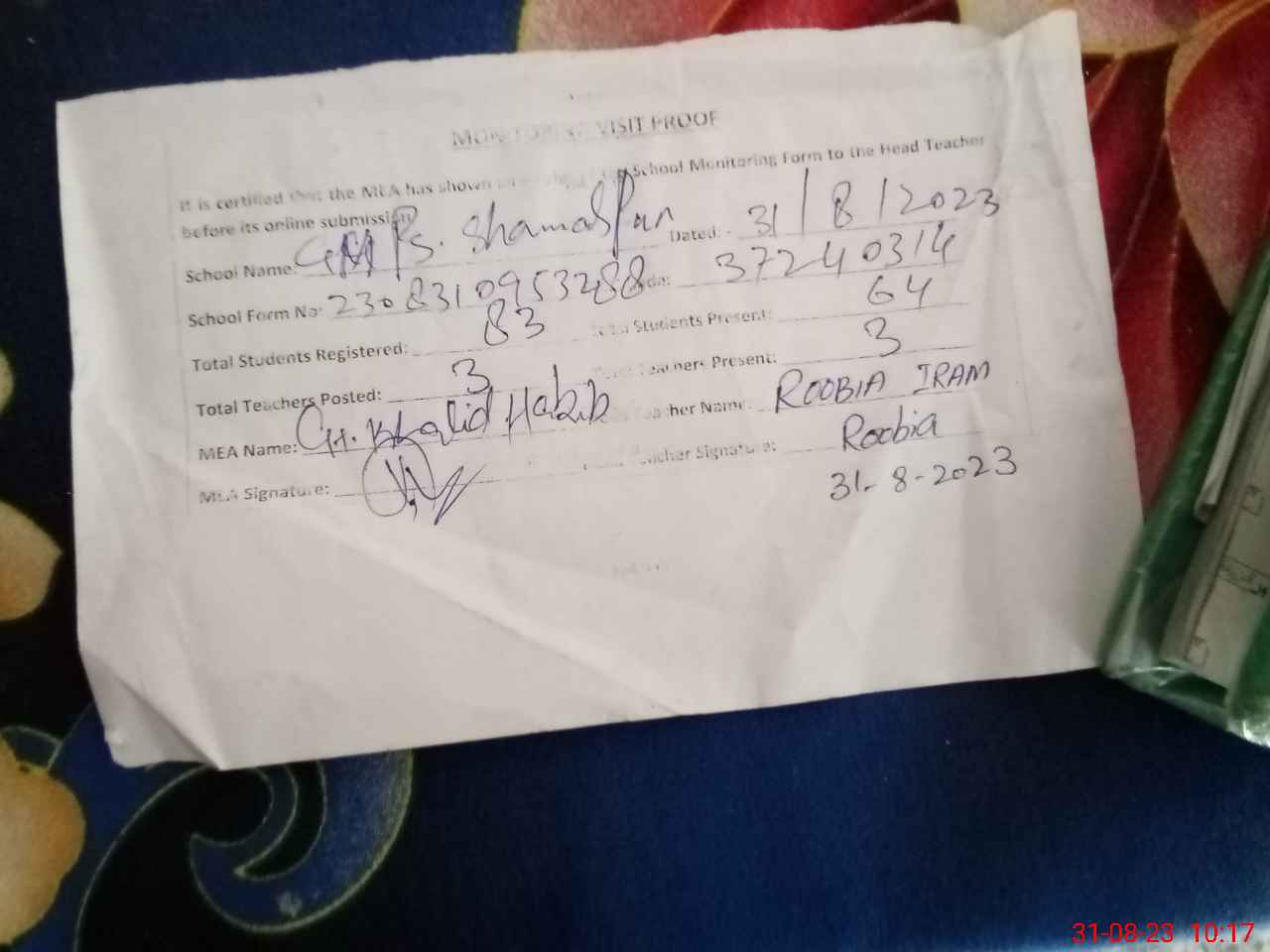 | Monitoring Date: 31-08-2023 | Start Time: 31-08-2023 09:53 AM | End Time: 31-08-2023 10:17 AM | Name of MEA: Kh**** ha**** | |