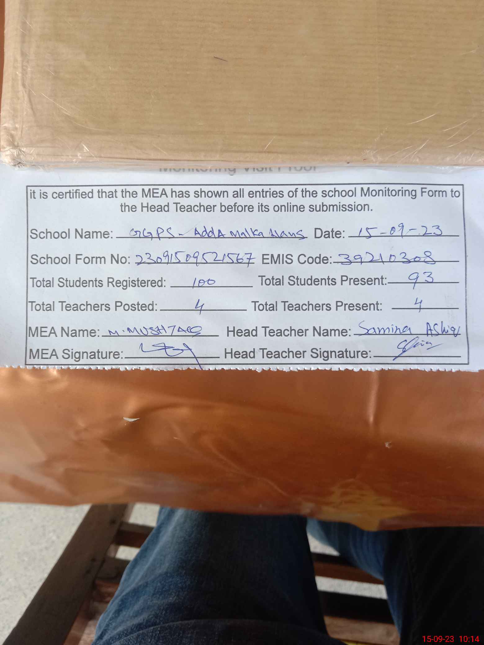 | Attendance Register | Head Teacher | MEA with School | Visit Proof |