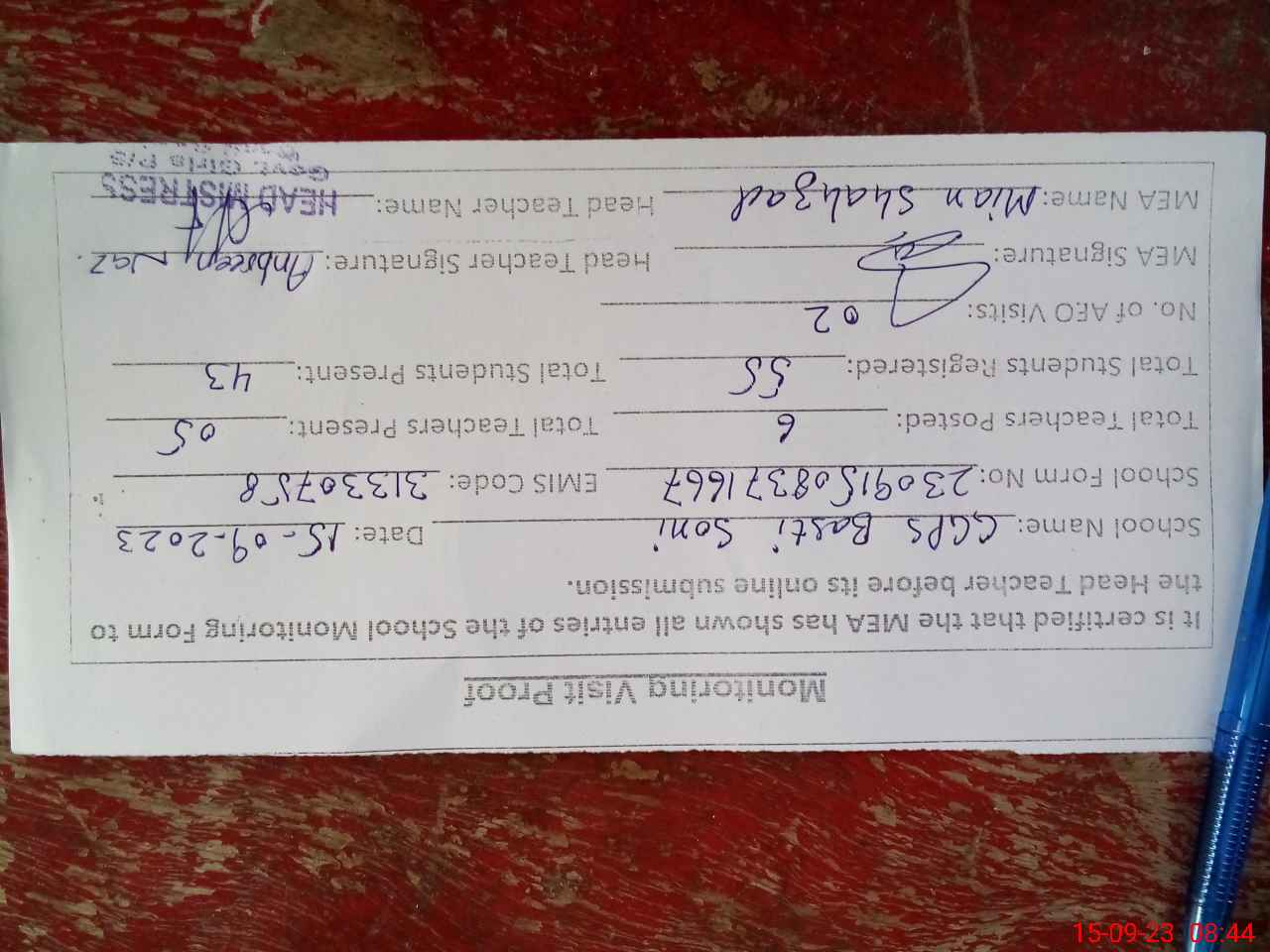 | Attendance Register | Head Teacher | MEA with School | Visit Proof |