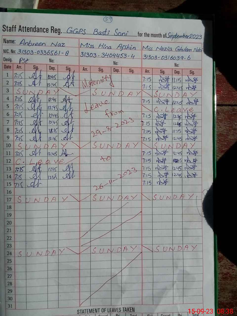 | CNIC | Full Name | Designation | R/C | Absence During Last Calender Month |