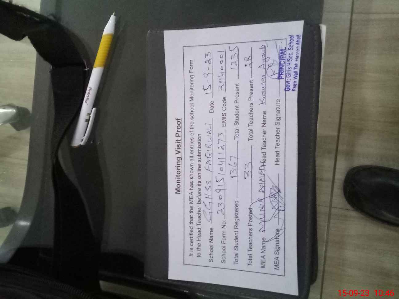 | Attendance Register | Head Teacher | MEA with School | Visit Proof |