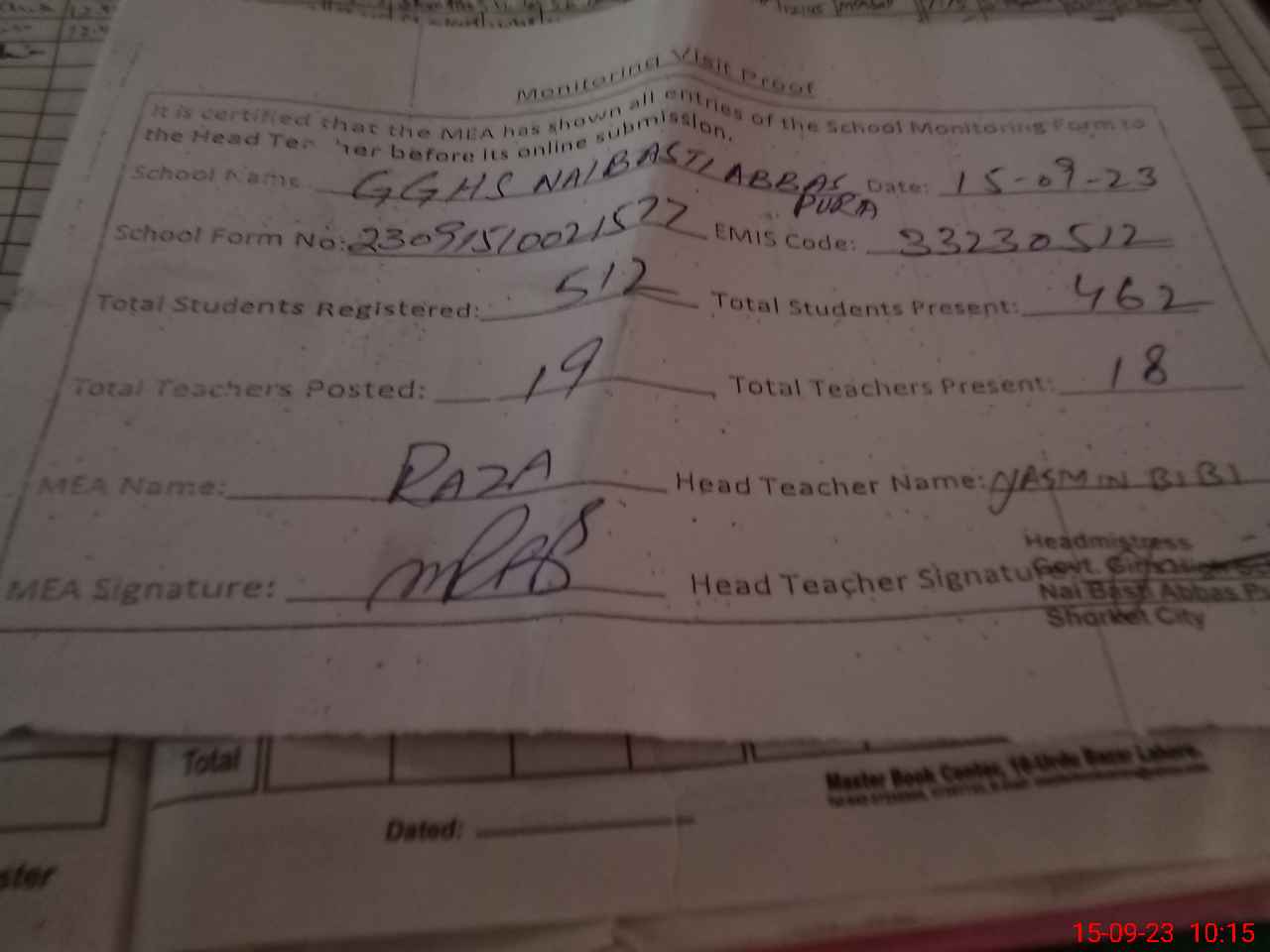 | Attendance Register | Head Teacher | MEA with School | Visit Proof |
