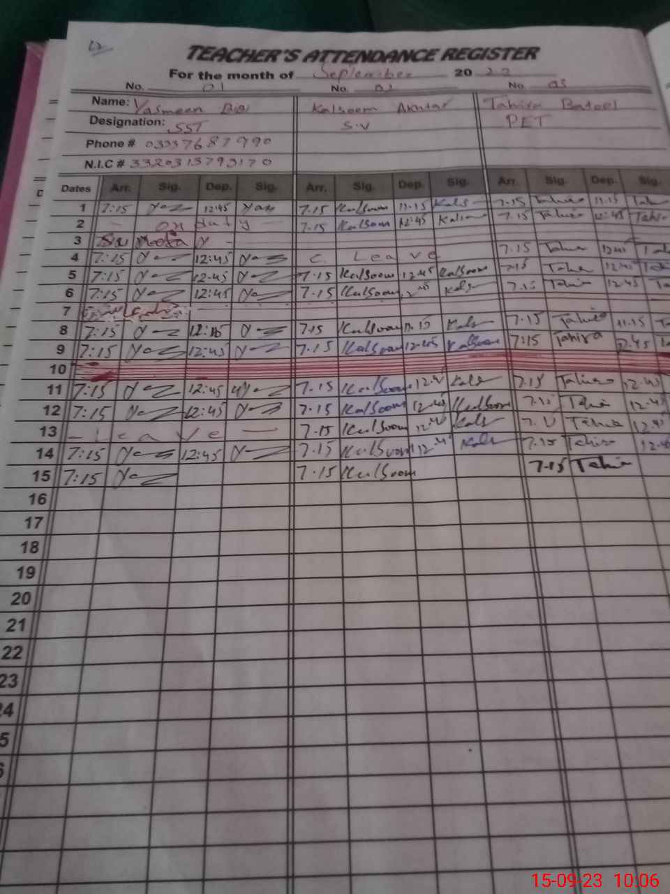 | CNIC | Full Name | Designation | R/C | Absence During Last Calender Month |