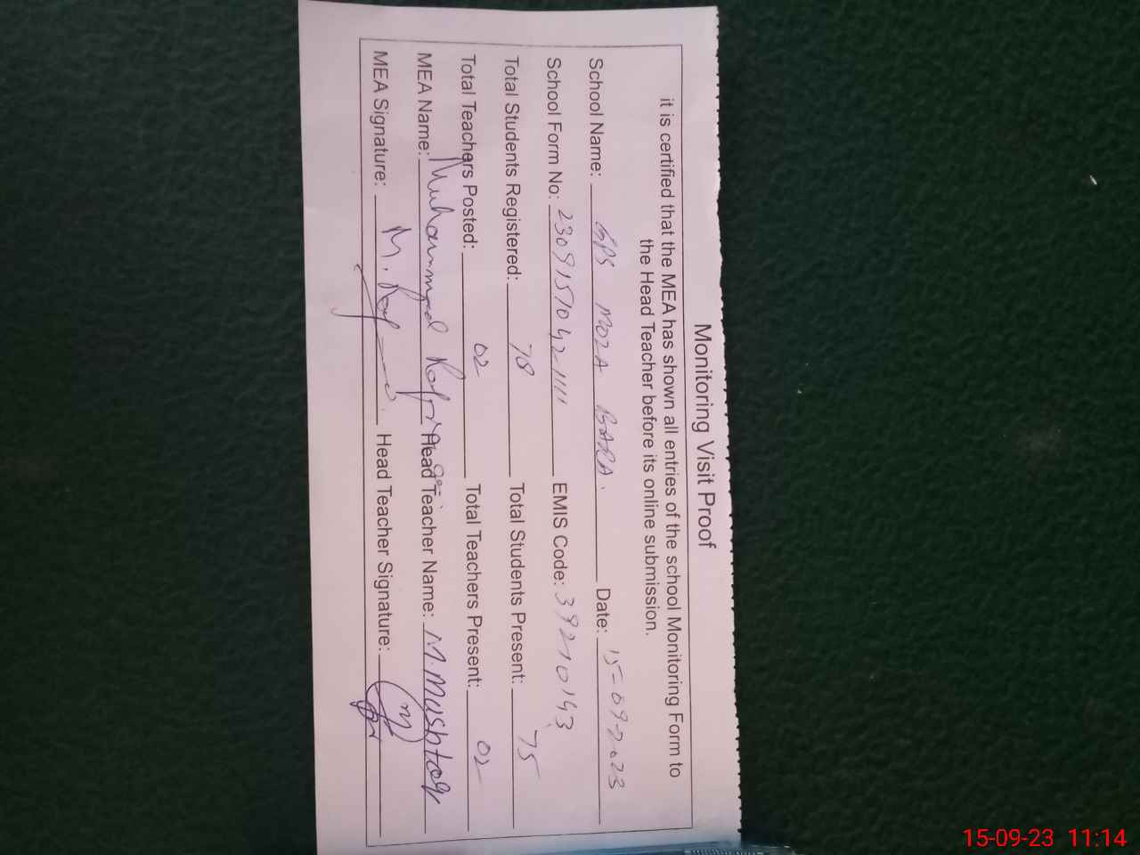 | Attendance Register | Head Teacher | MEA with School | Visit Proof |