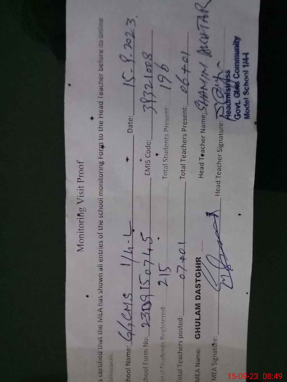 | Name: SH**** AK**** Designation: (School Headmaster's/Headmistress's) S.S.T.(Science) Phone/Cell Number: 03**** |