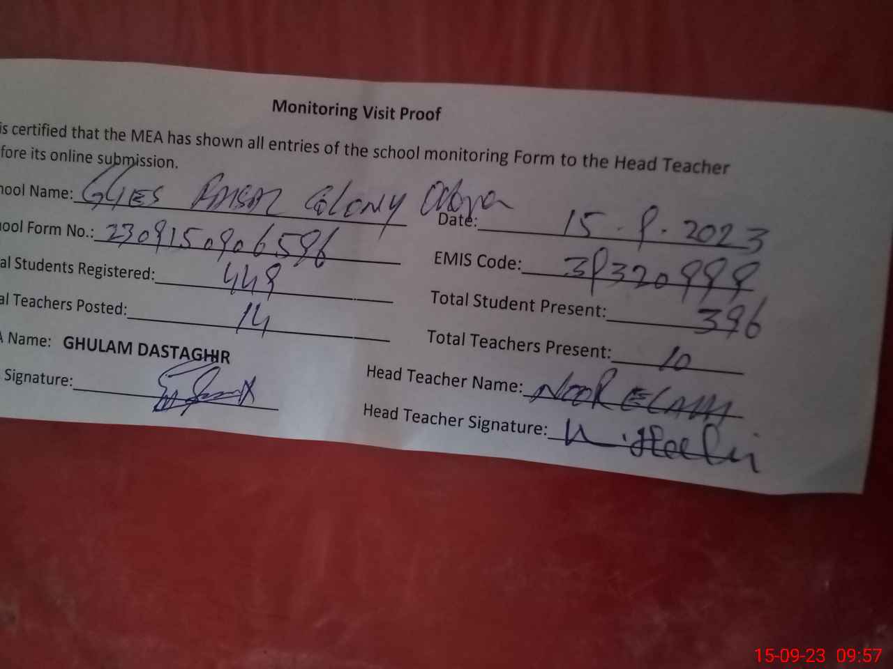 | Attendance Register | Head Teacher | MEA with School | Visit Proof |