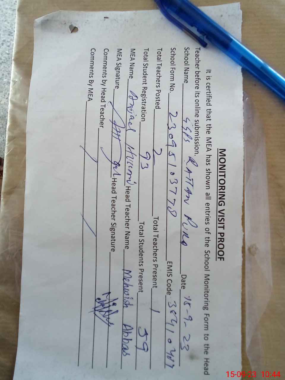 | Attendance Register | Head Teacher | MEA with School | Visit Proof |
