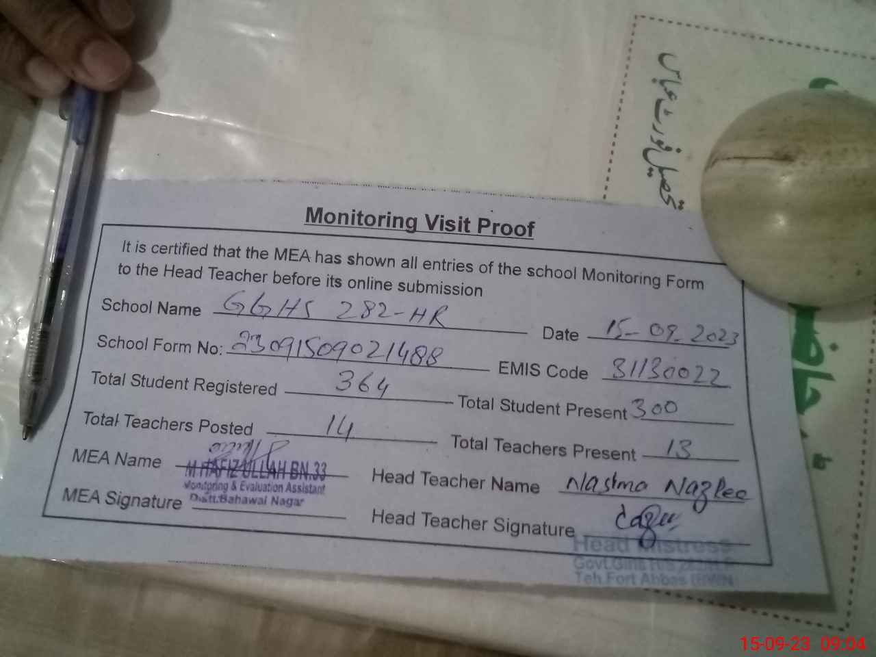 | Attendance Register | Head Teacher | MEA with School | Visit Proof |