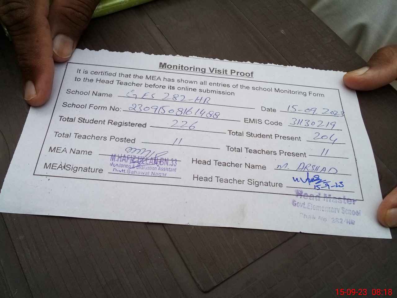 | Monitoring Date: 15-09-2023 | Start Time: 15-09-2023 07:58 AM | End Time: 15-09-2023 08:20 AM | Name of MEA: Mu**** Ha**** BN**** | |