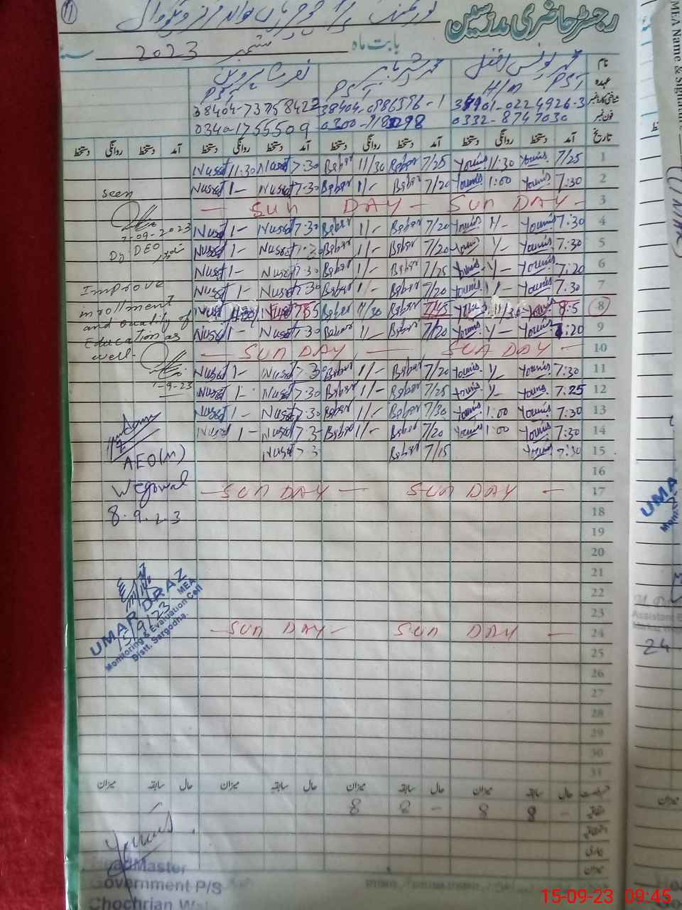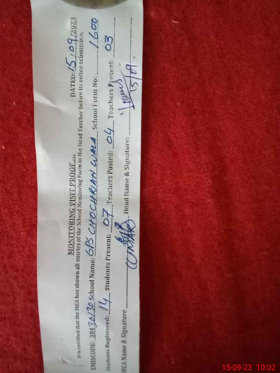 | Attendance Register | Head Teacher | MEA with School | Visit Proof |