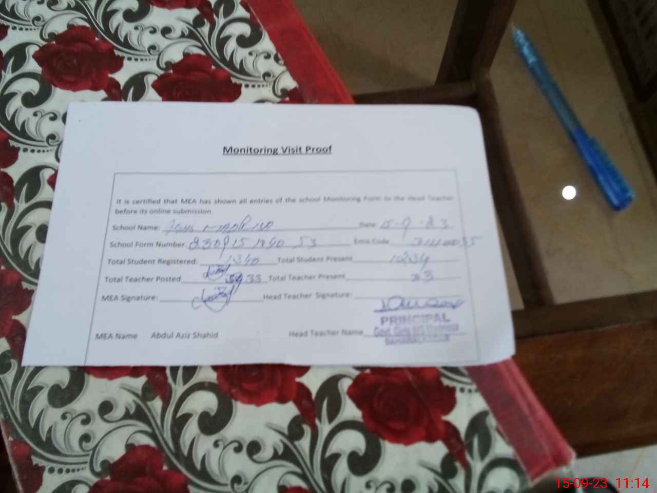 | Attendance Register | Head Teacher | MEA with School | Visit Proof |