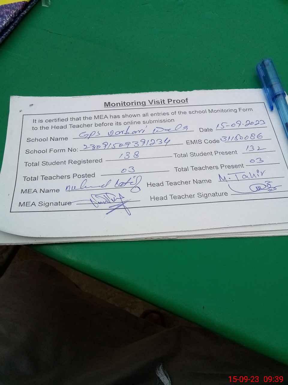 | Attendance Register | Head Teacher | MEA with School | Visit Proof |