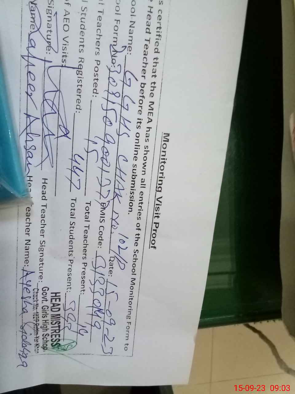 | Name: Ai**** Si**** Designation: (School Headmaster's/Headmistress's) Head Mistress Phone/Cell Number: 03**** |