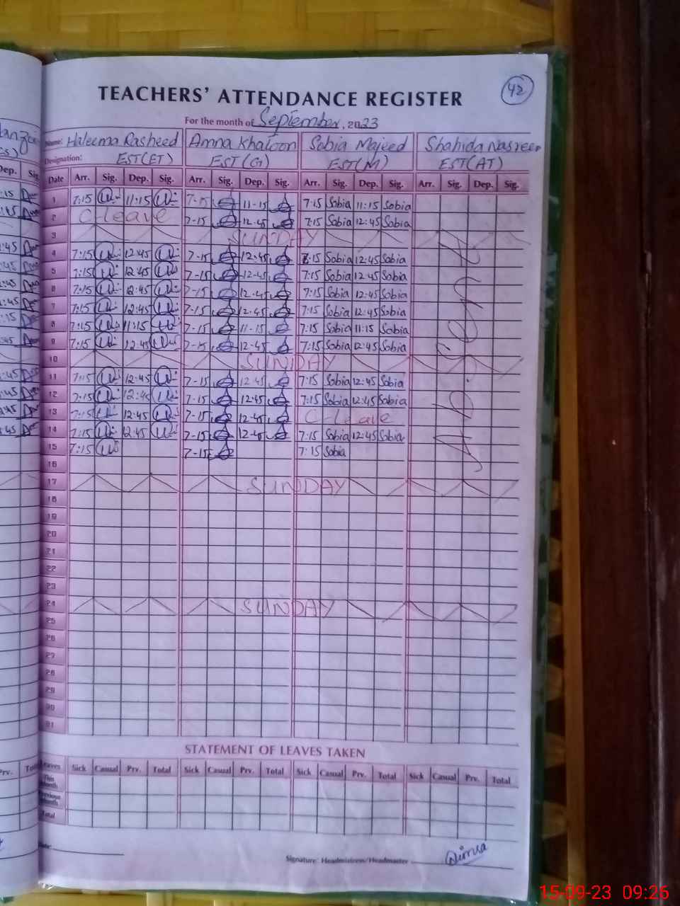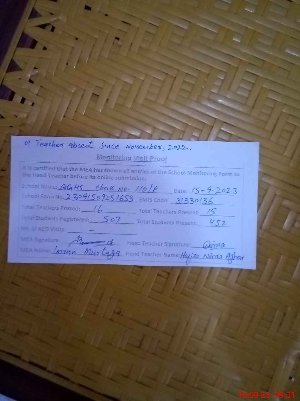 | Attendance Register | Head Teacher | MEA with School | Visit Proof |
