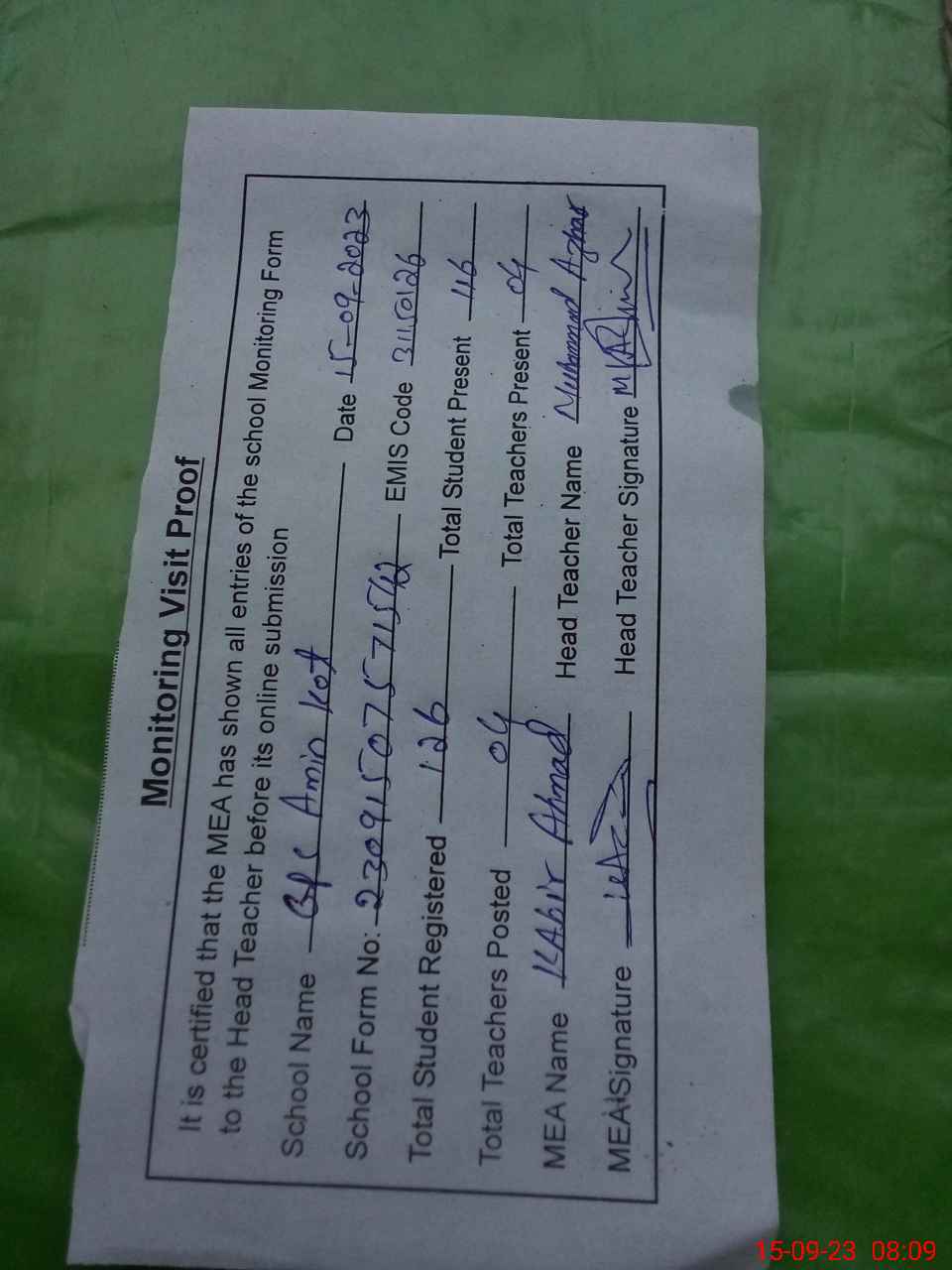 | Attendance Register | Head Teacher | MEA with School | Visit Proof |