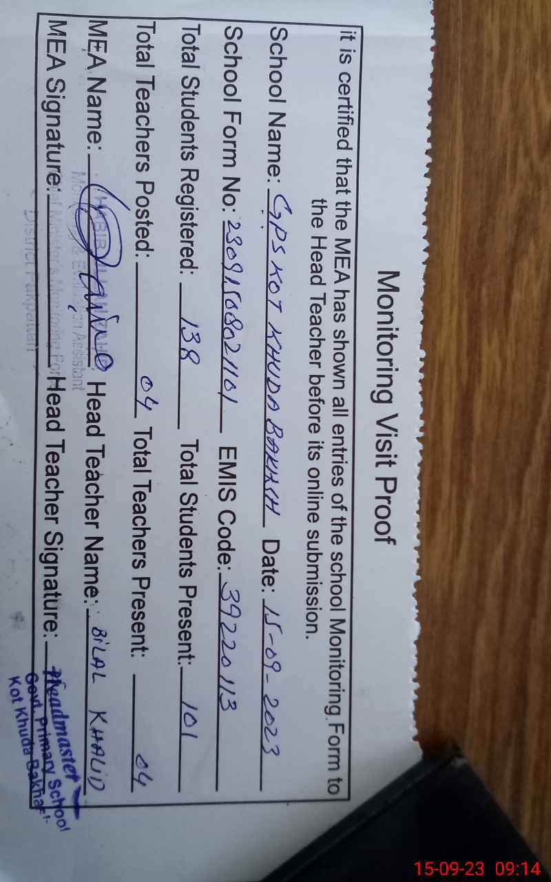 | EMIS Code: 39220113 | Name of School: GPS KOT KHUDA BUKHSH | |||