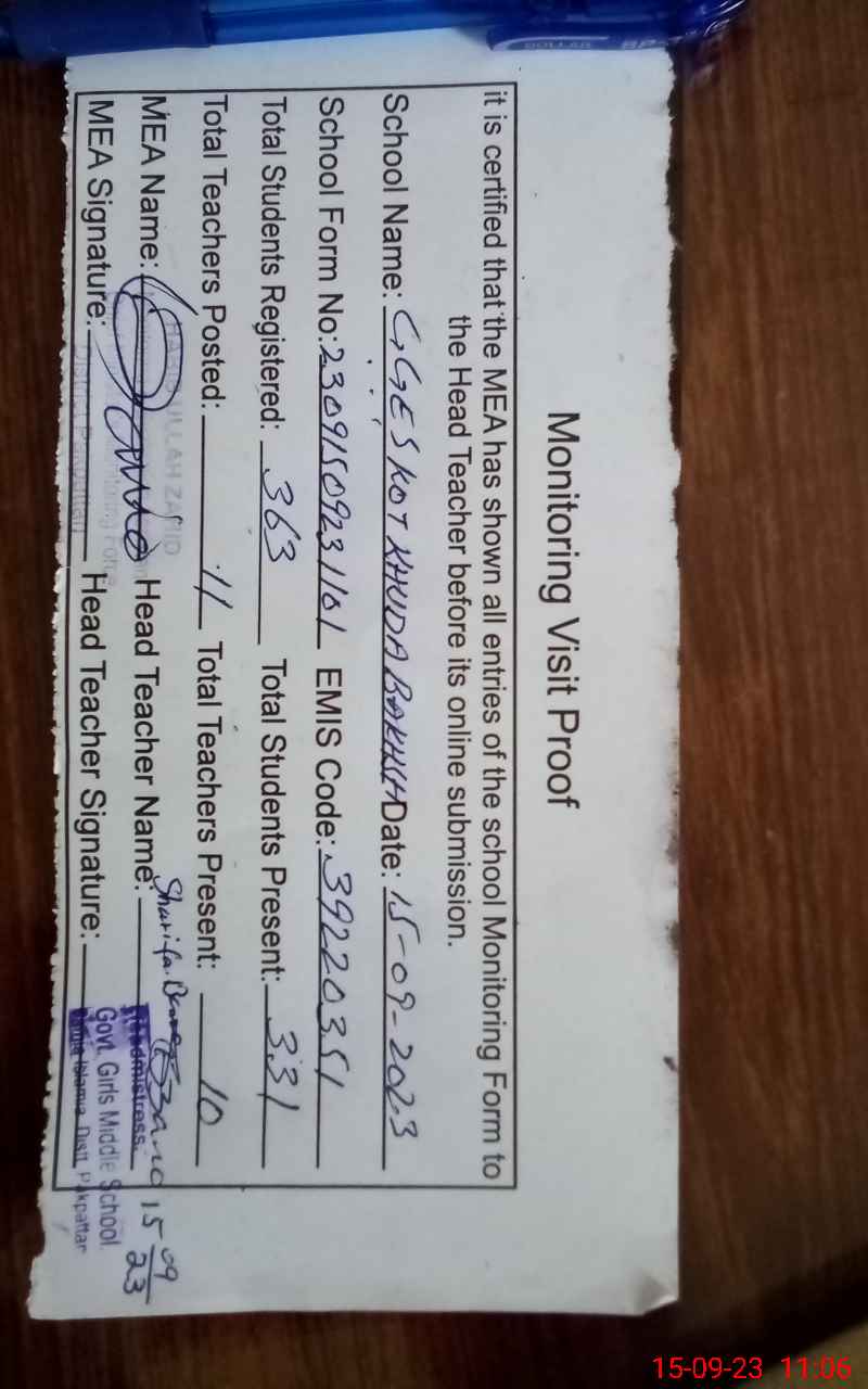 | EMIS Code: 39220351 | Name of School: GGES KOT KHUDA BUKSH | |||