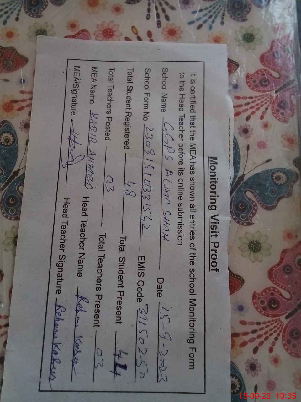 | EMIS Code: 31150250 | Name of School: GGPS CHAK ALAM SHAH | |||