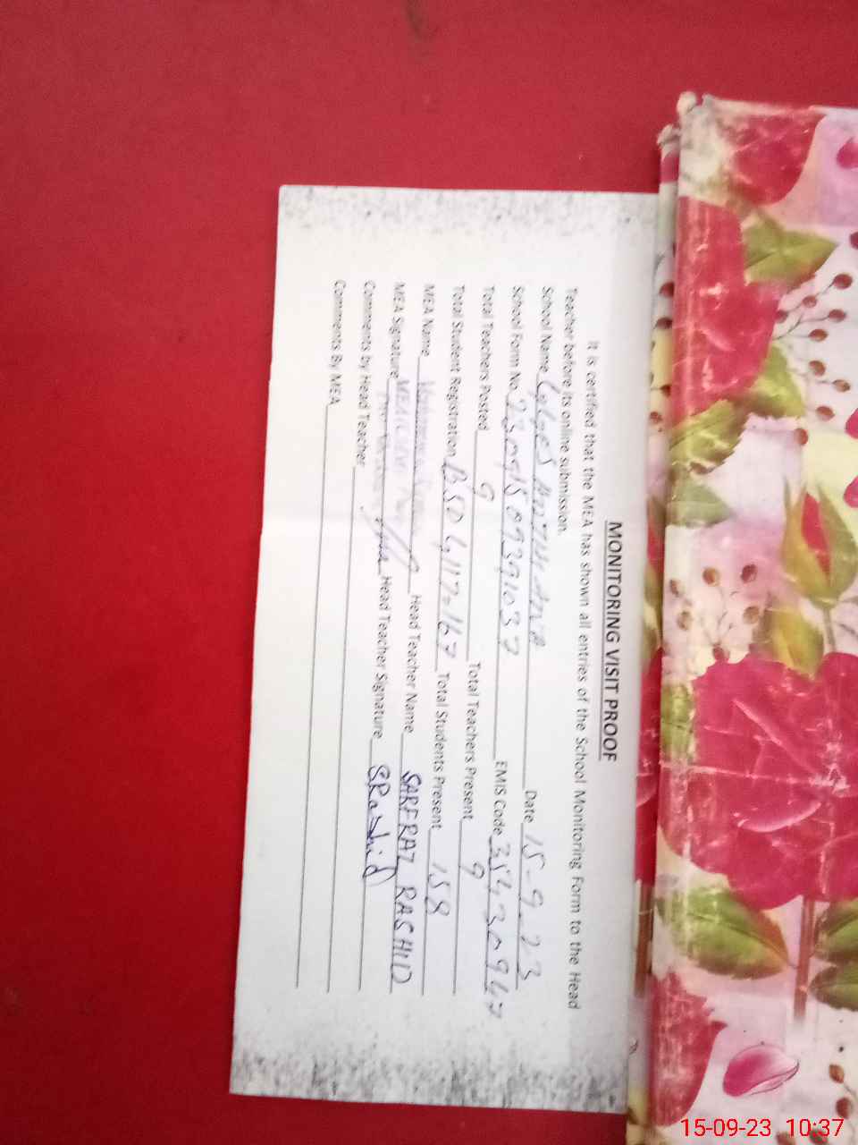 | Attendance Register | Head Teacher | MEA with School | Visit Proof |