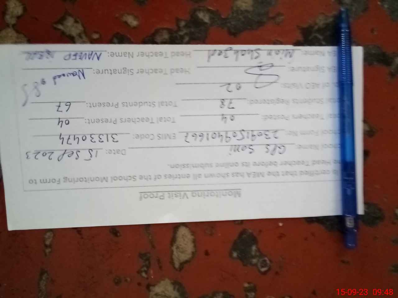 | Attendance Register | Head Teacher | MEA with School | Visit Proof |