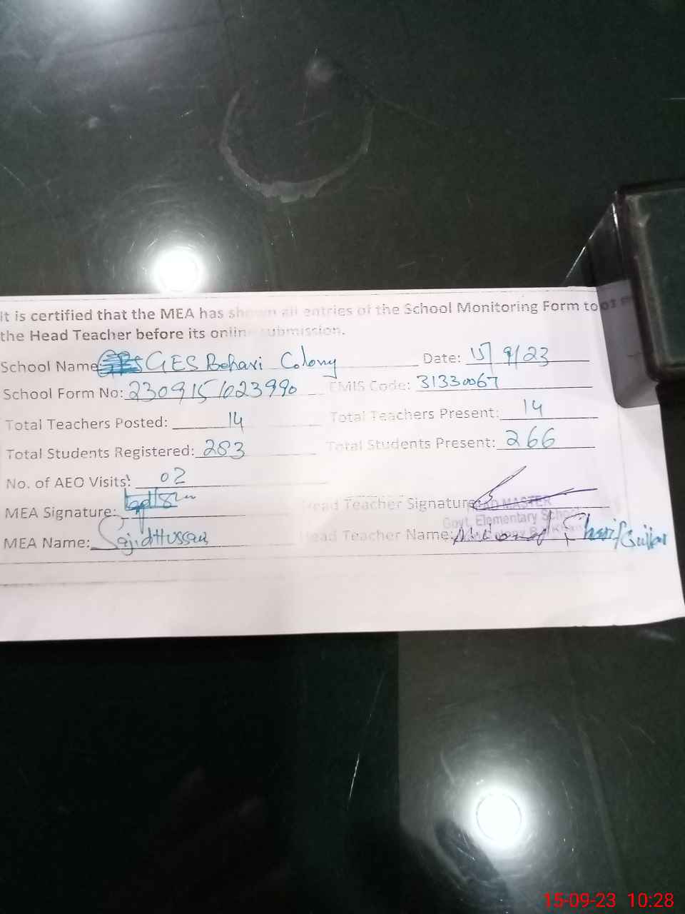 | Monitoring Date: 15-09-2023 | Start Time: 15-09-2023 09:55 AM | End Time: 15-09-2023 10:28 AM | Name of MEA: Sa**** Hu**** | |