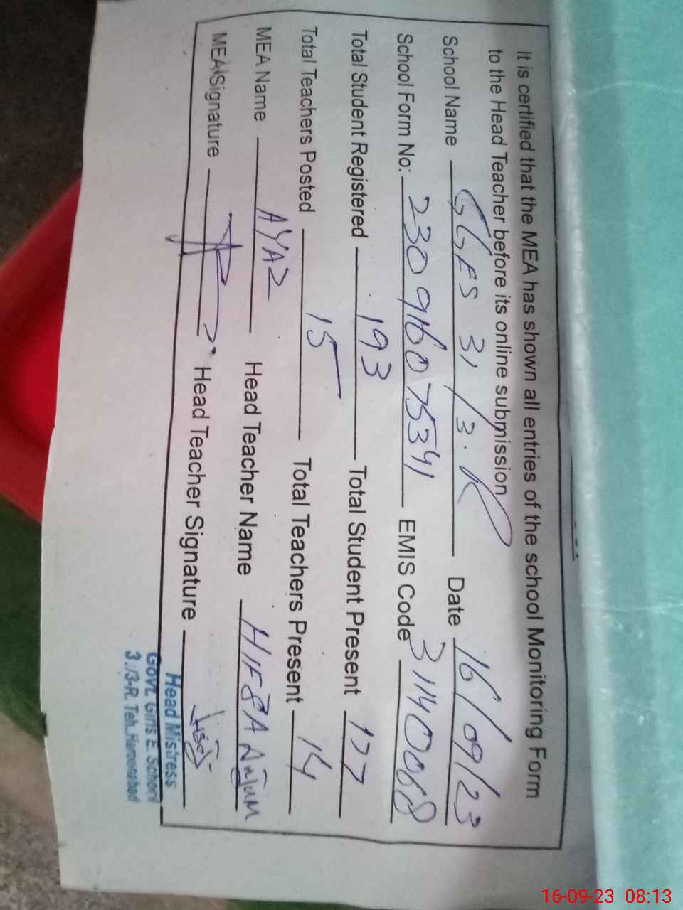 | Certified that this School was Inspected by the Undersigned MEA/DMO Today and the Information Stated Above is as Per Record. | |||||