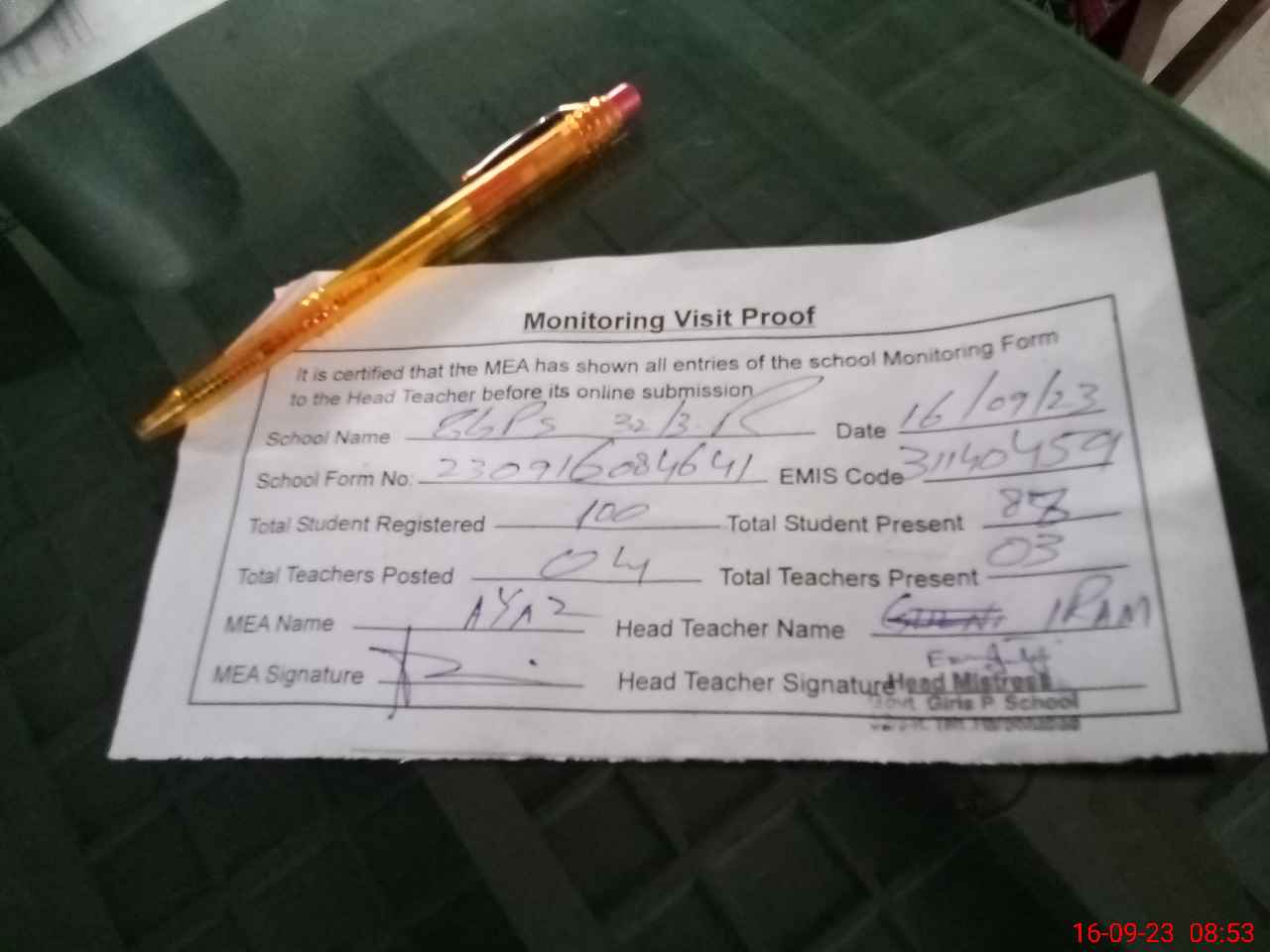 | Attendance Register | Head Teacher | MEA with School | Visit Proof |