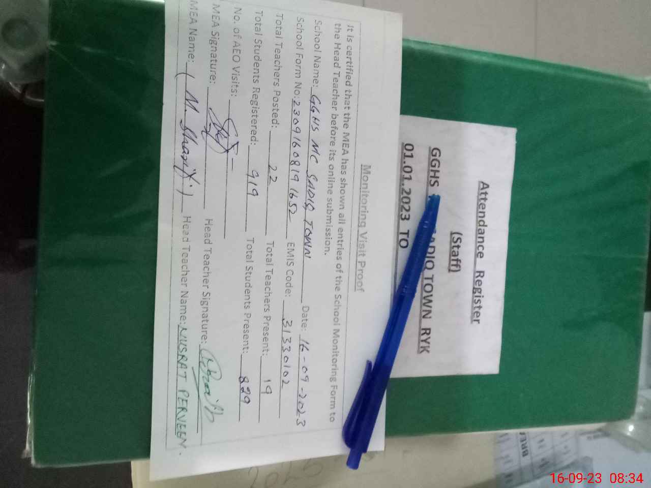 | Attendance Register | Head Teacher | MEA with School | Visit Proof |