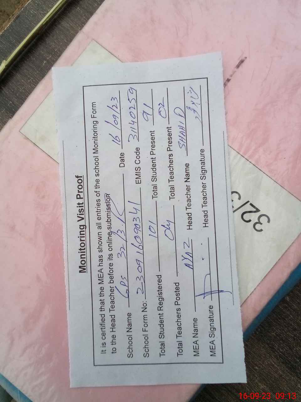 | Attendance Register | Head Teacher | MEA with School | Visit Proof |