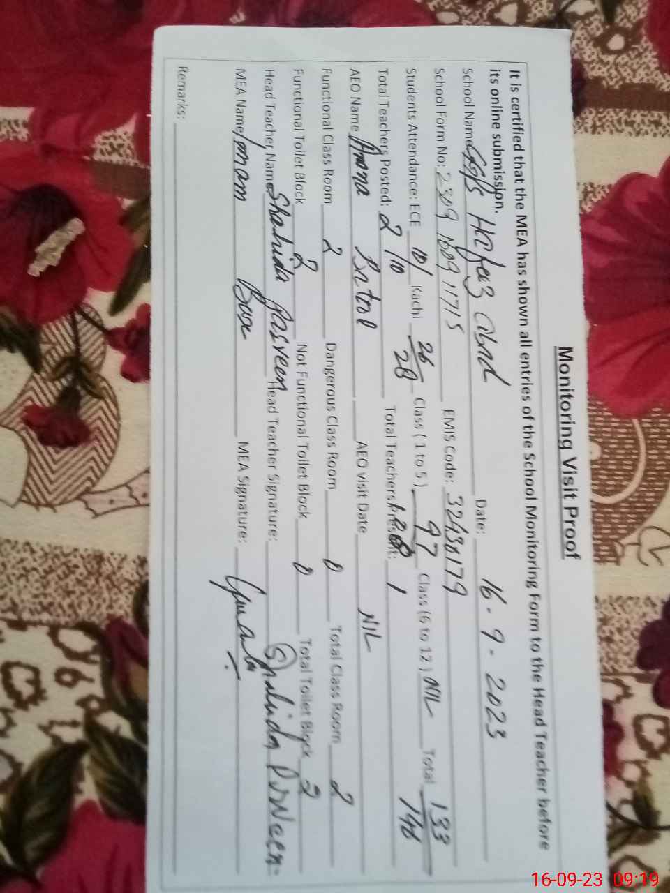 | Name: SH**** PE**** Designation: (School Headmaster's/Headmistress's) Headmisstress Phone/Cell Number: 03**** |