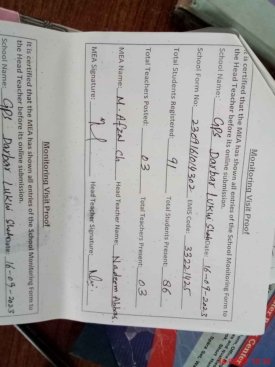 | Attendance Register | Head Teacher | MEA with School | Visit Proof |
