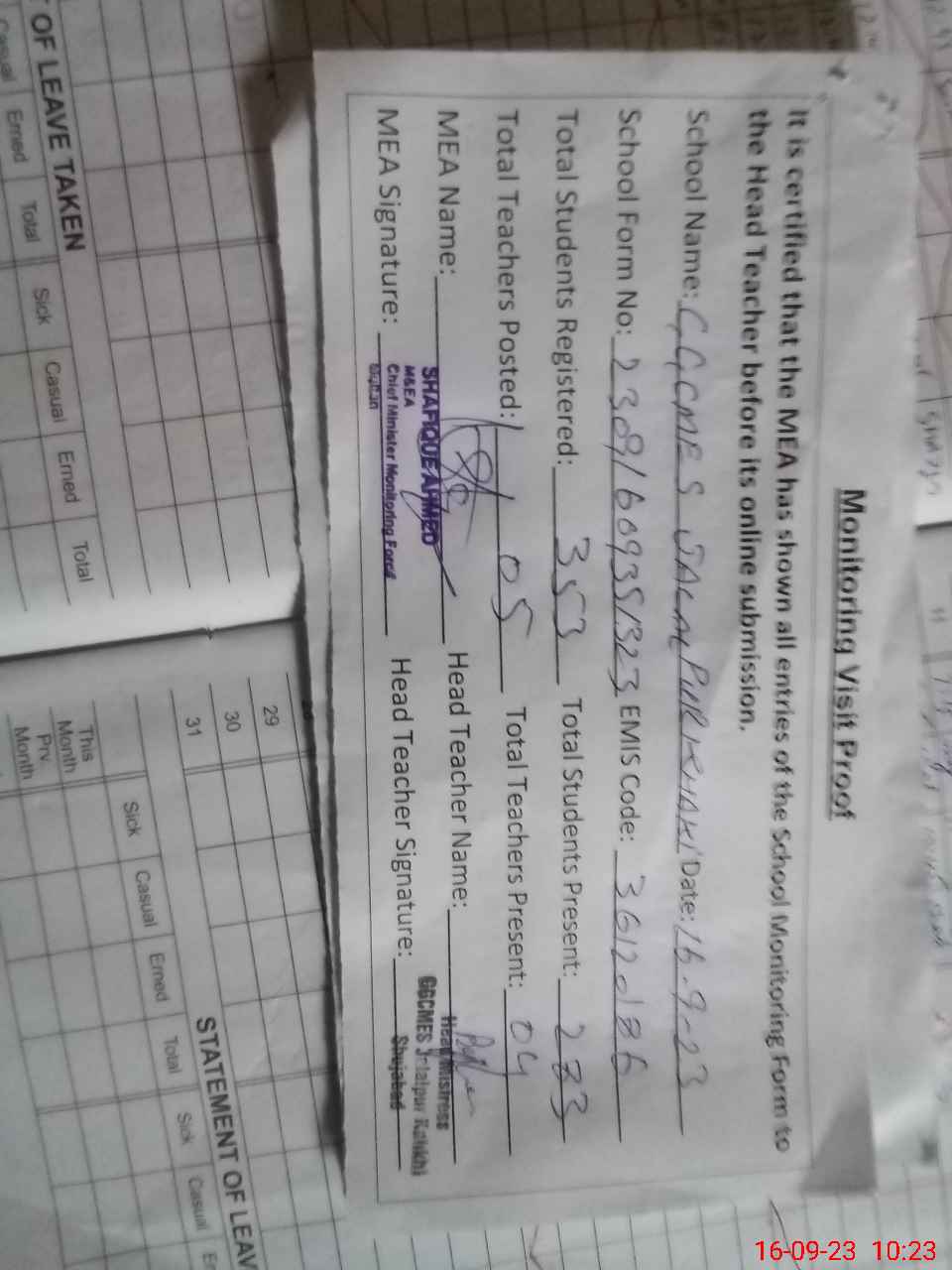 | Attendance Register | Head Teacher | MEA with School | Visit Proof |