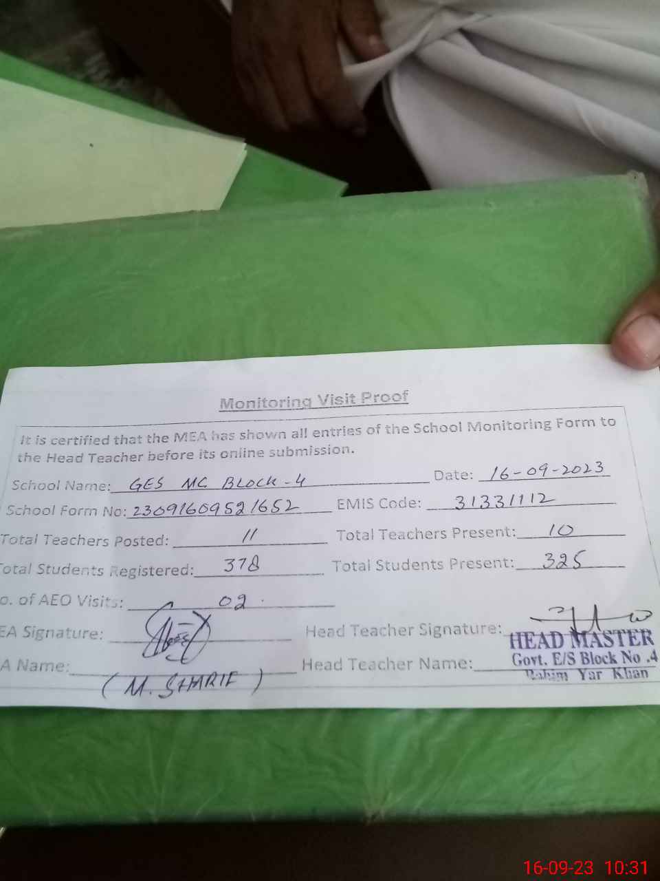 | Attendance Register | Head Teacher | MEA with School | Visit Proof |