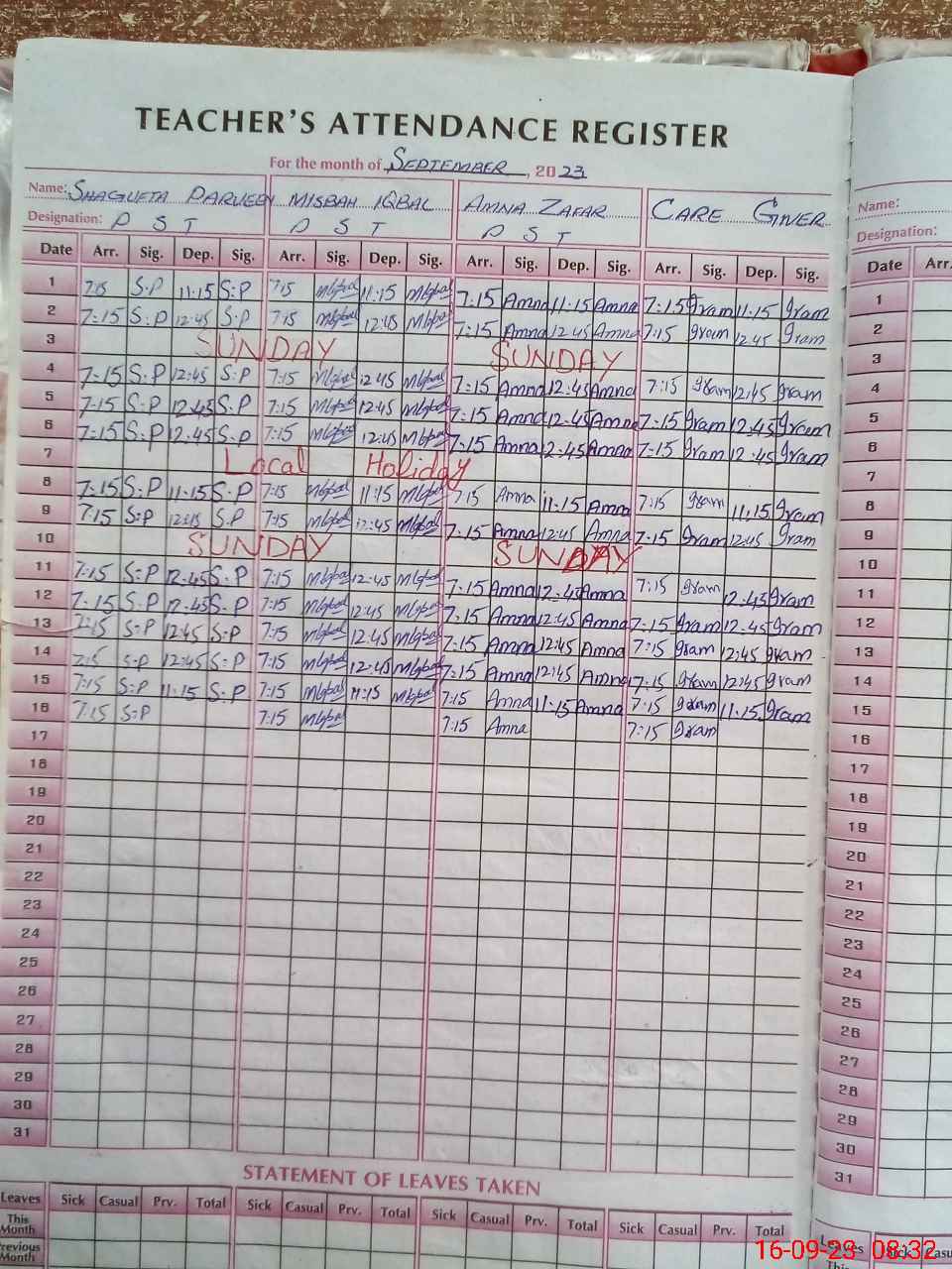 | Leave | Duty | Absent | Maternity | Medical | Ex- Pak |