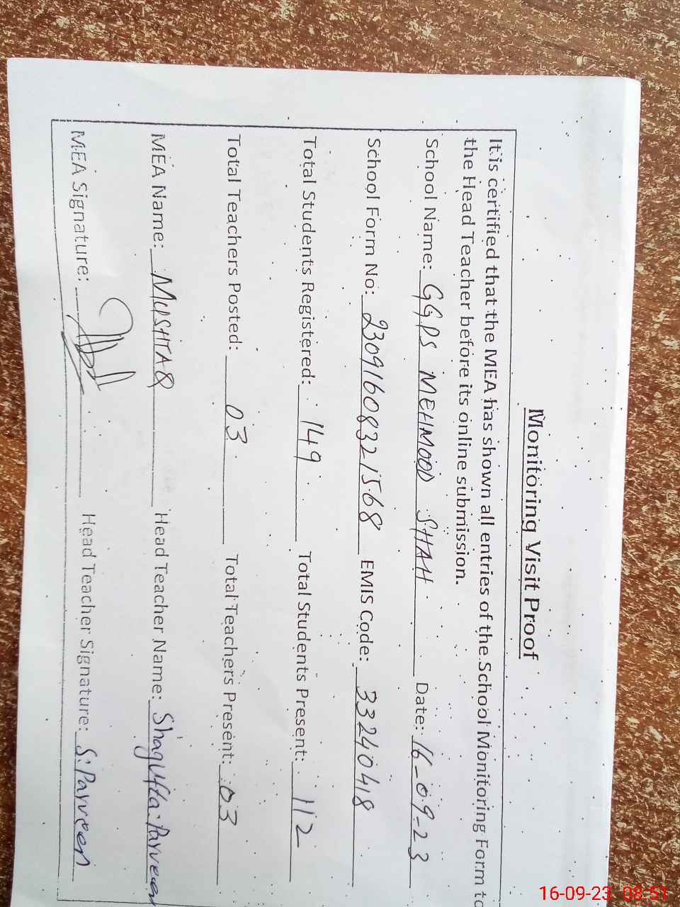 | Attendance Register | Head Teacher | MEA with School | Visit Proof |
