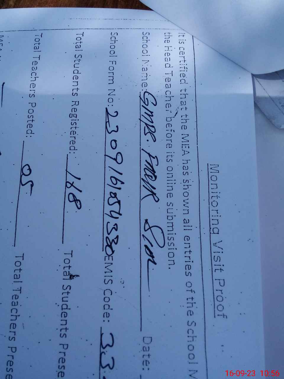 | Certified that this School was Inspected by the Undersigned MEA/DMO Today and the Information Stated Above is as Per Record. | |||||