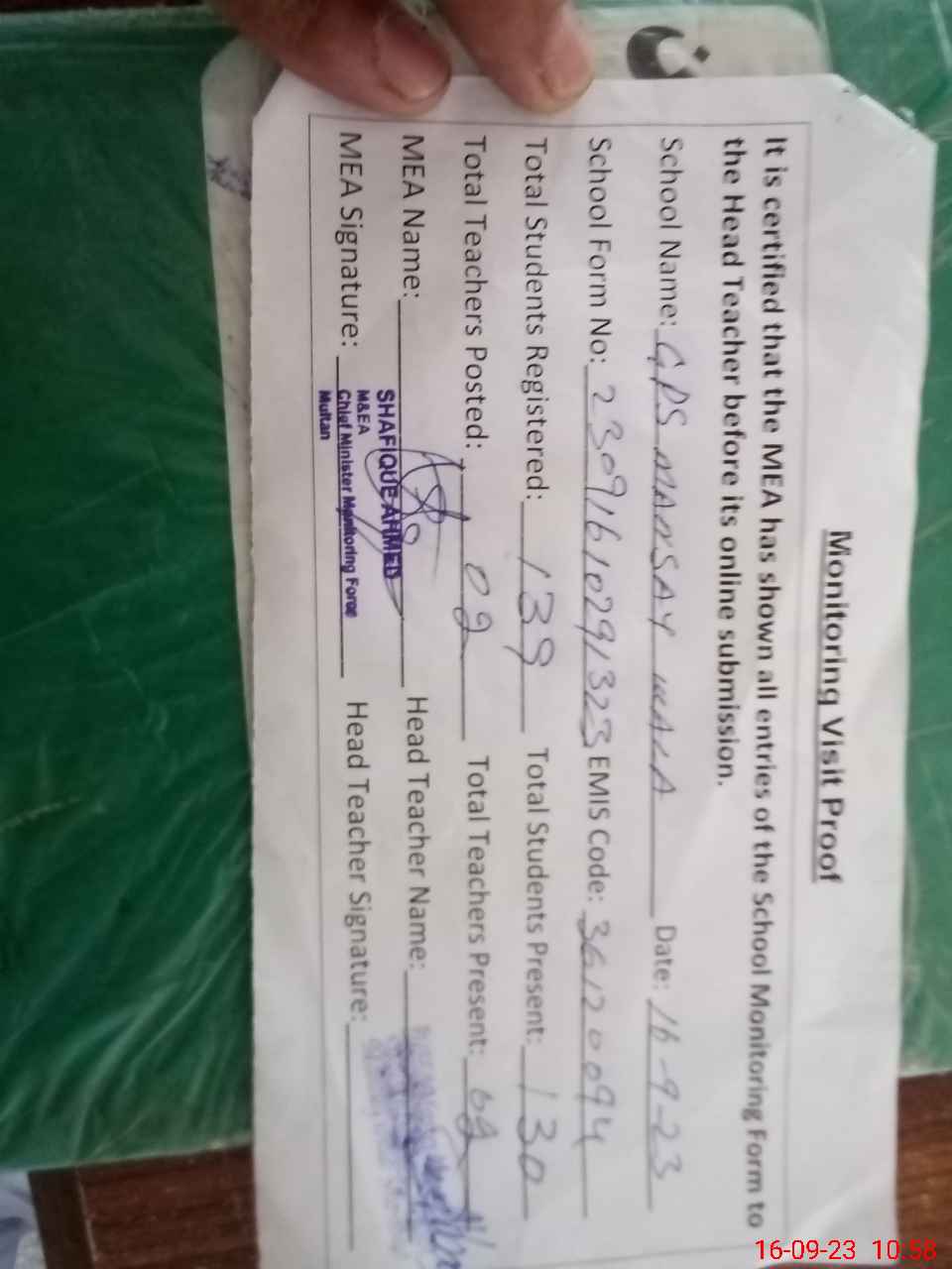 | Attendance Register | Head Teacher | MEA with School | Visit Proof |