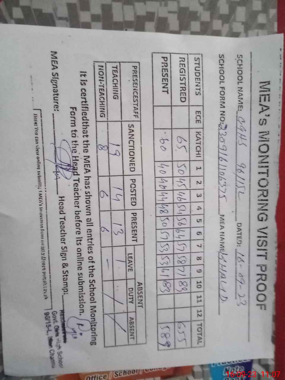 | Attendance Register | Head Teacher | MEA with School | Visit Proof |